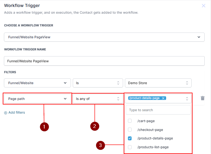The Page Path filter allows you to specify a portion of a URL path that will activate the workflow. For instance, if you want your automation to fire when a contact visits any page within a specific category or section of your website (e.g., /cart-page/ or /product-details-page/), you can define that path here. This is especially useful for creating targeted automation based on broader page groupings rather than specific URLs.